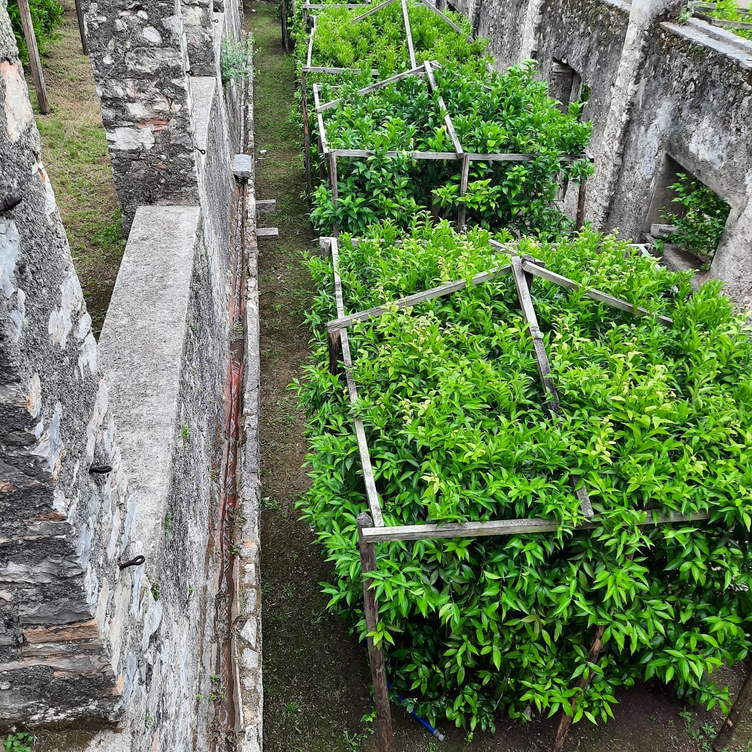 During the warm spring and summer, the terraces are open-air. Come late autumn, however, farmers would transform these structures into seasonal greenhouses: they fitted the frames with removable wooden boards and glass panels to enclose the lemon groves from November to March. High stone walls on the cold north side and at the ends of the terraces further shielded the trees from northerly winds. In especially frigid spells, fires or braziers were lit inside the covered limonaie to raise the temperature; at night one could see the lemon houses glowing from across the lake.