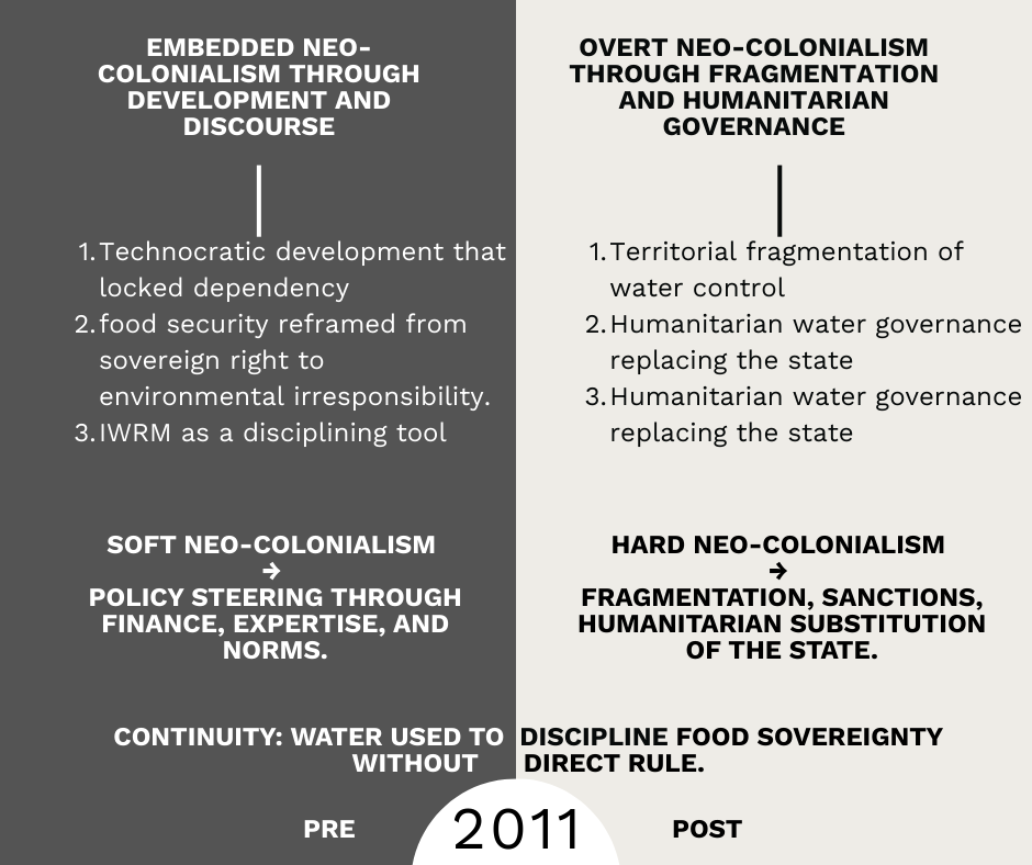 In the Syrian case, neo-colonialism operates less through direct territorial control and more through structural dependence: control over finance, technology, narratives, and access to water flows (upstream, institutional, or humanitarian). Water governance becomes a lever that constrains food sovereignty while appearing technocratic, humanitarian, or environmentally neutral.